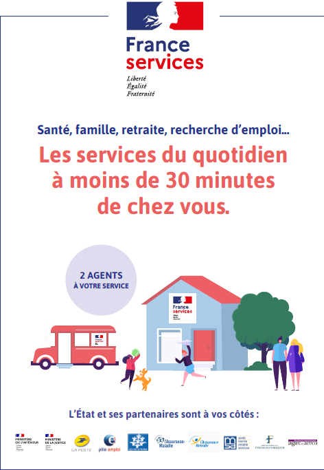 Les conseillers France-Services vous accompagnent dans les principales démarches administratives quotidiennes des 11 partenaires nationaux  : Allocations Familiales  – ANTS – Assurance Retraite – Assurance maladie – Chèque énergie – Finances Publiques – France travail – France Rénov’ – La Poste – M.S.A et Point justice.
